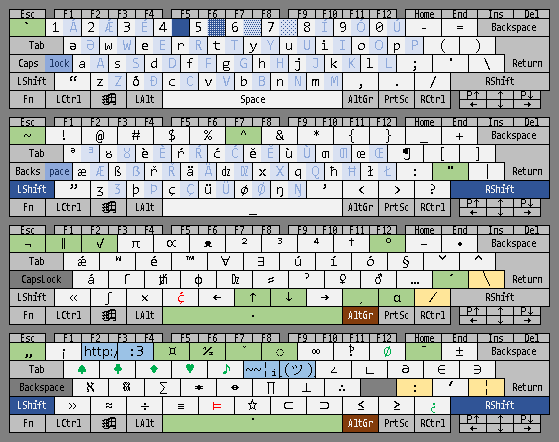 dk´ acute | duplication (1) AaÆæEeIiOoUuWwYyCcÇçGgKkLlMmNnPpRrSsZz._ʹ%♪†∫♀♂ ÁáǼǽÉéÍíÓóÚúẂẃÝýĆćḈḉǴǵḰḱĹĺḾḿŃńṔṕŔŕŚśŹź! ″‰♫‡∬⚢⚣ dk` grave | alteration (2) AaEeIiOoUuWwYyNn_♀♂«» ÀàÈèÌìÒòÙùẀẁỲỳǸǹ ⚤⚥‹› dk" diaeresis/umlaut | triplication (3) ƏəAaEeIiOoUuWwYyHhXx_ʹ%∫ ӚӛÄäËëÏïÖöÜüẄẅŸÿḦḧẌẍ ‴‱∭ dk^ circumflex/caret (4) AaEeIiOoUuWwYyCcGgHhJjSs_0123456789+-=()"" ÂâÊêÎîÔôÛûŴŵŶŷĈĉĜĝĤĥĴĵŜŝ ⁰¹²³⁴⁵⁶⁷⁸⁹⁺⁻⁼⁽⁾«» dk~ tilde (5) AaEeIiOoUuYyNnVv=_ ÃãẼẽĨĩÕõŨũỸỹÑñṼṽ≈ dkˇ caron (6) AaEeIiOoUuCcDdDZDzdzGgHhKkLlNnRrSsTtZzƷʒ_0123456789+-=() ǍǎĚěǏǐǑǒǓǔČčĎďDŽDždžǦǧȞȟǨǩĽľŇňŘřŠšŤťŽžǮǯ ₀₁₂₃₄₅₆₇₈₉₊₋₌₍₎ dk˙ dotabove/middledot (7) AaEeIOoWwYyBbCcDdFfGgHhMmNnPpRrSsſTtXxZz_+Ll ȦȧĖėİȮȯẆẇẎẏḂḃĊċḊḋḞḟĠġḢḣṀṁṄṅṖṗṘṙṠṡẛṪṫẊẋŻż ∔Ŀŀ dk¯ macron (8) AaÆæEeIiOoUuYyGg_#-…∈∋ ĀāǢǣĒēĪīŌōŪūȲȳḠḡ ‾——⋶⋽ dk° ring above (9) AaUuwy_CcPpRr%N…1234567890 ÅåŮůẘẙ ©©℗℗®®‰№ꙮ①②③④⑤⑥⑦⑧⑨⑩ =+-×/•*–☆ ⊜⊕⊖⊗⊘⊙⊛⊝⛤ dk¬ logical NOT (10) <≤=≥>≈≡&∧|∨∈∋∞∃/⊨⊂⊃ ≮≰≠≱≯≉≢⊼⊼⊽⊽∉∌⧞∄∤⊭⊄⊅ dk¤ currency (11) BbCcEeFfIiPpRrYy ₿₿¢¢€€₣₣₹₹££₽₽¥¥ dk◌ dotted circle (12) -—/_aeioucdhmrtvx→∞ ̵ ̶ ̸ ̲ ͣ ͤ ͥ ͦ ͧ ͨ ͩ ͪ ͫ ͬ ͭ ͮ ͯ ͢ ᪲ dk· dot below (13) AaEeIiOoUuYyBbDdHhKkLlMmNnRrSsTtZz_ ẠạẸẹỊịỌọỤụỴỵḄḅḌḍḤḥḲḳḶḷṂṃṆṇṚṛṢṣṬṭẒẓ dk„ tildebelow/middletilde (14) EeIiUubdfLlmnprstz_<> ḚḛḬḭṴṵᵬᵭᵮⱢɫᵯᵰᵱᵲᵴᵵᵶ ‹› dk¸ cedilla (15) EeĔĕCcĆćDdGgHhKkLlNnRrSsTt_ ȨȩḜḝÇçḈḉḐḑĢģḨḩĶķĻļŅņŖŗŞşŢţ dk∥ doublestruck/parallel (16) ABCDEFGHIJKLMNOPQƏRSTUVWXÐYZ 𝔸𝔹ℂ𝔻𝔼𝔽𝔾ℍ𝕀𝕁𝕂𝕃𝕄ℕ𝕆ℙℚℚℝ𝕊𝕋𝕌𝕍𝕎𝕏𝕏𝕐ℤ abcdefghijklmnopqərstuvwxðyz 𝕒𝕓𝕔𝕕𝕖𝕗𝕘𝕙𝕚𝕛𝕜𝕝𝕞𝕟𝕠𝕡𝕢𝕢𝕣𝕤𝕥𝕦𝕧𝕨𝕩𝕩𝕪𝕫 0123456789_←→↔π<> 𝟘𝟙𝟚𝟛𝟜𝟝𝟞𝟟𝟠𝟡 ⇐⇒⇔ℼ«» dk½ fractions (17) 1234567890ƏəQqWwEeRrTtYyUuIiOoPp ⅛¼⅜½⅝¾⅞⅟⅑↉⅒⅒⅒⅒⅕⅕⅖⅖⅗⅗⅘⅘⅙⅙⅓⅓⅔⅔⅚⅚⅐⅐ dk√ roots (18) ²³⁴ √∛∜ dkα greek letters (19) UPSDFGJLCVwertyuipasdfghjklzðxcvbnm ΘΠΣΔΦΓΞΛΨΩςερτυθιπασδφγηξκλζχχψωβνμ dk↑ superscripts/upperhalfs | updirection (20) əwertyuiopasdfghjklzðcvbnm ᵊʷᵉʳᵗʸᵘⁱᵒᵖᵃˢᵈᶠᶢʰʲᵏˡᶻᶞᶜᵛᵇⁿᵐ ᵊᴕèŕćĕùƣœæßřädzxqħłʒþçüøŋ ᵊᴽᵋʴᵓᵌᶸᶤᶛᵆᵝʵᵅᶨˣˁʱᶩᶾᶱᶝᶶᶲᵑ ƏWERTYUIOPASDFGHJKLZÐCVBNM ᴲᵂᴱᴿᵀᵞᵁᶦᴼᴾᴬᶽᴰᶡᴳᴴᴶᴷᴸᶥᵟᵙⱽᴮᴺᴹ ᴲȢÈŔĆĔÙƢŒÆẞŘÄDZXQĦŁƷÞÇÜØŊ ᴲᶷᵄʶᶵˠᵕᶧᵔᴭᶳᶮᶺᴯᵡˀᵸᶫᶼᶿᶴᶹᵠᴻ 0123456789+-=().!¡ᴥ?…,: ⁰¹²³⁴⁵⁶⁷⁸⁹⁺⁻⁼⁽⁾·ꜝꜞᵜˀ⋯˒⠘ ∫←→ ⌠⭦⭧ dk↓ subscripts/lowerhalfs | downdirection (21) acehijklmnopərstuvwxyz ₐ𞁞ₑₕᵢⱼₖₗₘₙₒₚₔᵣₛₜᵤᵥₓ 0123456789+-=() ₀₁₂₃₄₅₆₇₈₉₊₋₌₍₎ ∫…←→ ⌡⋮⭩⭨